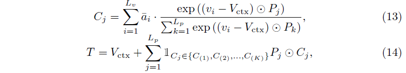 Video context 토큰 V_{ctx}는 단순히 비디오 내 클립들의 토큰을 평균내어 만들어줍니다. 동시에 moment-descriptive 토큰도 만들어줍니다. 이 과정은 우선 각 클립에서 V_{ctx}를 뺌으로써 distinctive characteristic을 모델링해주고, 이들과 saliency candidates pool에 있는 토큰들과의 유사도를 구합니다. 이 saliency candidates pool이 정확히 무엇으로부터 시작하는지 언급이 없는데, 아무래도 learnable vector인 것으로 보입니다. 이에 대해서는 추후 코드를 좀 살펴보아야 확실히 알 수 있을 것 같습니다. 이후에는 앞선 그림 3에서 얻었던 \bar{a}를 가중치로 사용해 클립 별로 곱해줍니다. 이 과정은 수식 13과 동일합니다.