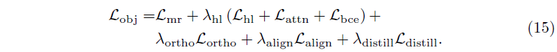 CG-DETR 학습에 사용되는 최종 loss는 위 수식에서의 \mathcal{L}_{obj}와 같습니다. \mathcal{L}_{mr}은 Moment Retrieval을 위한 loss로 예측 구간과 GT 구간 간 L1 loss + GIoU loss를 의미합니다. 나머지 loss들은 모두 본문에서 언급한 바와 같습니다.