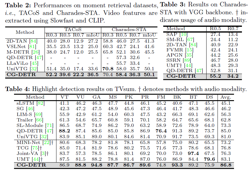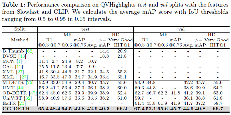 위 표 1은 QVHighlights 데이터셋의 test, val split에서의 성능입니다. CG-DETR이 2024 ECCV에 게재되었음을 감안하면 꽤나 인상적인 성능 향상 폭입니다. test split에서 MR의 평균 mAP는 3%, HD mAP는1% 이상 향상되었습니다. 이번에 읽은 CG-DETR이 제가 기존에 생각하던 조금 더 fine-grained한 수준의 모델링을 제안하였지만 이렇게까지 복합적인 후속연구가 바로 다음 해에 등장할 줄은 몰랐습니다. 정량적 성능이야 많이 올랐지만 코드가 공개되어있으니 잘 분석해보아야겠습니다.