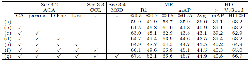 CG-DETR이 제안한 모듈에 대한 ablation study 결과입니다. (b)는 cross-attention 적용, (c)는 cross-attention 내 dummy token 활용, (d)는 dummy token 활용 시 encoding까지 수행을 의미합니다. 세부적인 구현상 디테일까지 ablation에 담고있고 각각이 유의미한 성능 향상을 보여주고 있음을 알 수 있습니다.