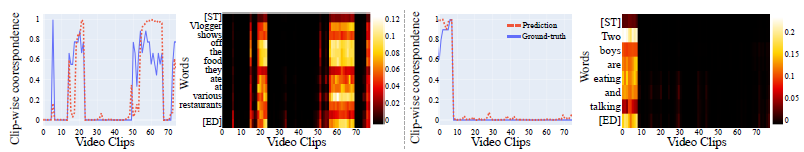 2. To further calibrate the interaction degree, we discover and distill the clip-word correlation from the aligned space at video-sentence level