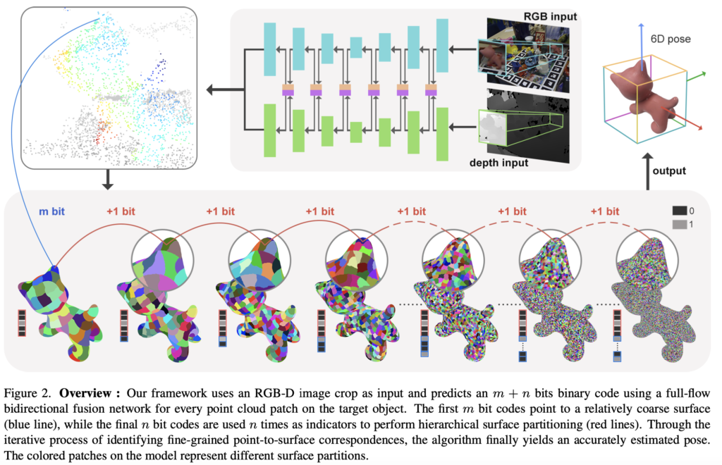 encoding의 첫 번째 m비트는 depth로부터 얻은 포인트 클라우드와 3D CAD 모델의 surface \mathcal S_{m}에 대한 3D-3D correspondence를 생성하는 역할을 합니다. 이는 \mathcal S_{m}에 대해 중심점(전체 3D CAD 모델에 대한)을 계산하고 3D 포인트를 사용하여 생성하게 됩니다. 이러한 대응 관계로부터 coarse한 pose를 얻을 수 있겠네요. 이러한 coarse pose를 fine pose로 refinement하는 과정을 m+1비트부터 m+n비트까지 반복하여 진행합니다. 그림(2)의 아래 행 그림을 보시면 refinement를 반복하는 과정에서 interest surface의 크기가 점점 감소하는 것을 볼 수 있습니다. 이러한 반복을 통해 pose 정확도 상승 뿐만 아니라, outlier까지 제거할 수 있는 효과도 있었다고 하네요.