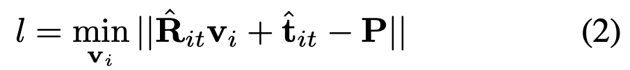 그림(3)은 위의 내용을 시각적으로 나타내고 있습니다. 따라서, 식(2)와 같이 포인트 클라우드 내의 점 \mathbf P와 변환이 적용된 surface 사이의 최소 거리를 정의할 수 있습니다.