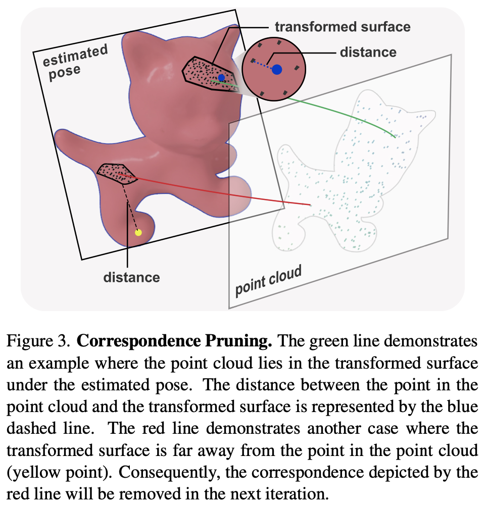 다시 그림(2)의 빨간선은 sub-surface에 대한 분할 과정을 나타내고 있습니다. 반복하는 과정 중에 surface가 줄어들면 대응 관계에 대해 학습하기가 점점 어려워 질 것이고 이는 곧 confidence score 마저 떨어뜨리게 될텐데요. 저자는 이러한 문제를 해결하기 위해 세분화된 반복 과정을 진행하면서 세분화된 surface에 대해 pose 추정을 수행하기 전에 hierarchical correspondence pruning 과정을 진행합니다.
