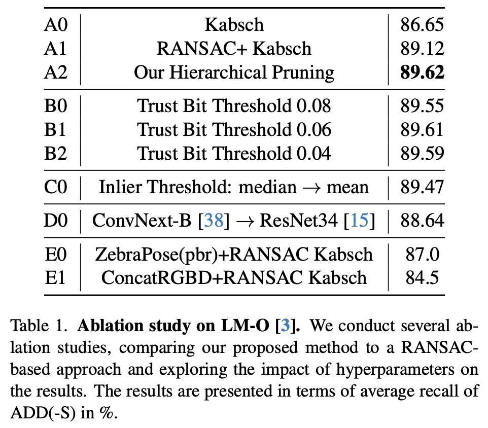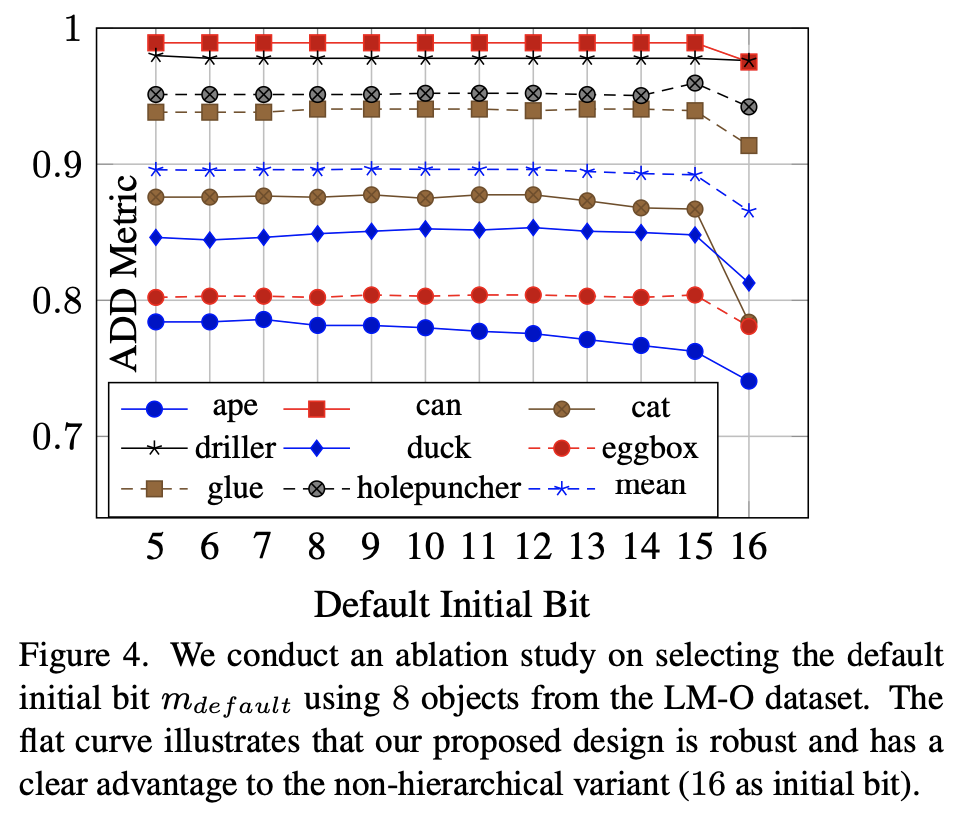 작은 초기 비트를 사용하는 것은 상대적으로 coarse한 surface correspondence와 매칭을 시킨다는 의미를 갖게 되는데요. 하지만 저자가 제안한 신뢰 비트를 사용하여 초기 surface에 대한 선택이 가능하게 되어 각 vertex가 개별적으로 고려되어 가장 신뢰할 수 있는 초기 비트에 대응이 되도록 합니다. 이에 대한 증명을 하는 그림(4)을 보면, 5비트에서 11비트까지는 초기 비트 선택에 대해 강인한 모습을 보이지만 12번째 비트부터 시작하면 ape에서 성능이 떨어지기 시작하는 모습을 확인할 수 있습니다. 해당 실험을 통해 9~11번째 비트를 초기 비트로 사용하면 좋은 결과를 얻을 수 있다는 것을 알 수 있었다고 하며, 정확도와 계산 효율성을 모두 고려하여 10번째 비트를 사용하여 리포팅을 했다고 하네요.