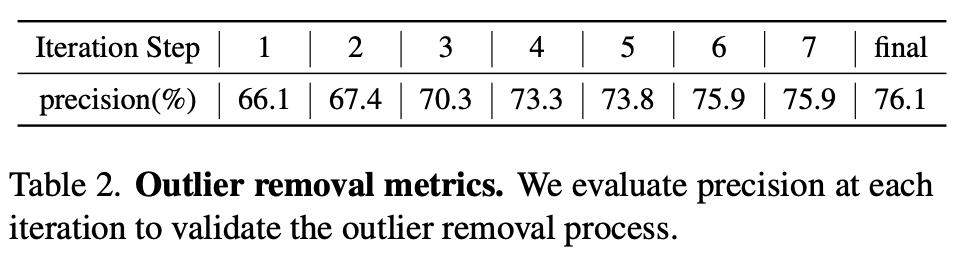 또한 표(2)는 각 반복마다 outlier 제거에 대한 정밀도를 측정한 표입니다. 추정 좌표와 GT 좌표 사이의 거리가 10mm 미만일 경우 옳은 샘플로 정의합니다. 반복 과정을 통해 점진적으로 outlier들이 제거 되면서 정밀도가 증가하는 것을 확인할 수 있습니다.