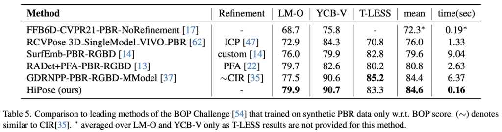 마지막으로 BOP benchmark 데이터셋들에 대해 결과를 보여주는 표(5)입니다. 해당 표에는 시간이 주로 많이 사용되는 refinement 과정에 의존하는 방법론도 있습니다. HiPose는 refinement 과정 없이 바로 추정을 하여도 기존의 방법론들에 비해 우세한 성능을 보여주고 있습니다. GDRNPP 같은 경우 HiPose와 비슷한 성능을 보이지만, refinement 과정을 거친 GDRNPP 보다 HiPose가 40배 더 빠른 모습을 보여주고 있으며 이러한 결과를 통해 HiPose는 정확도뿐만 아니라 계산적으로 효율적으로 수행하고 있다는 것을 증명합니다.