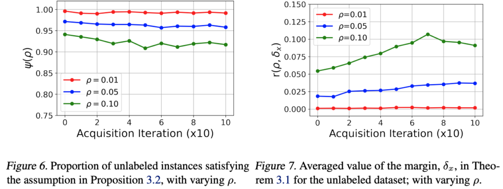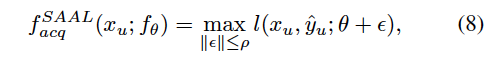 여기서 저자는 두번째 항 Loss가 높은 데이터를 선택하도록 acquisition function을 설계하였습니다. 즉 최대 perturb loss를 갖는 인스턴스를 선택하여 레이블을 부여하면, 해당 인스턴스는 더 이상 ??에 속하지 않고 ??에 포함됩니다. 따라서 ??​의 최대 Loss 인스턴스를 제거함으로써 ???​​ (즉, ?_{????}​)를 직접 줄일 수 있게 됩니다.