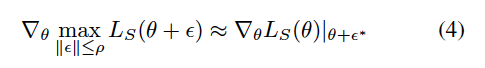 즉, 수식 (4)는 최대 교란 ?를 고려한 loss 함수의 기울기를 근사하는 방법을, 파라미터 ?에서의 loss 함수 ?_?​의 기울기를 최대 교란 방향 ϵ∗에서 계산하여, 이를 통해 최대화된 loss를 반영한 기울기를 얻게 될 수 있습니다.
