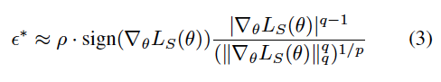 수식 (3)은 loss 함수의 gradient를 이용하여 최대 교란 ϵ∗를 계산하는 방법을 나타낸 것으로, ϵ∗는 loss를 최대화하는 방향으로의 작은 변화로, 파라미터 ? 주변의 loss landscape에서 가장 sharp한 방향을 찾게 됩니다.