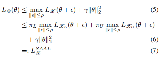 SAM 논문에서 population dataset의 Loss인 \mathscr{D} 는 학습 데이터의 maximally perturbed loss인 \mathscr{X} 에 의해 상한이 결정된다고 하였습니다. AL에서 학습데이터는 라벨이 있는 \mathscr{X_L} 과 라벨이 없는 \mathscr{X_U} 로 나뉩니다. (즉, \mathscr{X} = \mathscr{X_L} ∪ \mathscr{X_U} ).