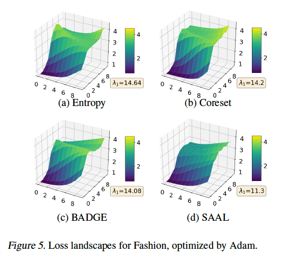 • Figure 4a: SAAL은 SAM 옵티마이저를 사용할 때, 다른 베이스라인보다 낮은 최대 perturb loss 값을 보입니다. 이는 SAAL이 높은 perturb loss 값을 가진 인스턴스를 선택하고, 이를 레이블된 데이터셋에 추가하여 제거했기 때문이라고 합니다.