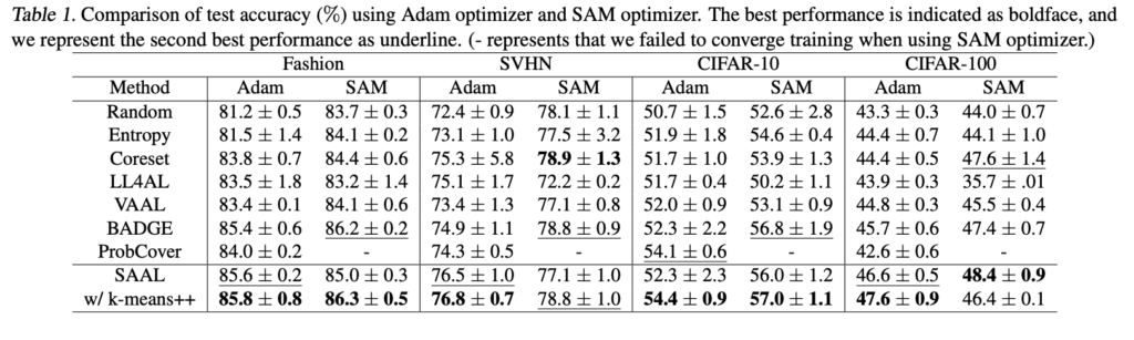 -> SAM optimizer는 애초에 일반화 성능을 목적으로 제안된 것이라 충분한 효과를 기대해볼 수 있을 듯 합니다. 본 논문에서는 이미 개발된 SAM optimizer를 AL에 적용하는 방식을 제안한 것이라서요