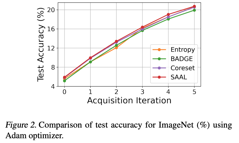 • ImageNet 실험에서는 Adam 옵티마이저를 사용해 각 획득 단계 후 500 epoch 동안 학습, 모든 설정을 세 번씩 반복 실험