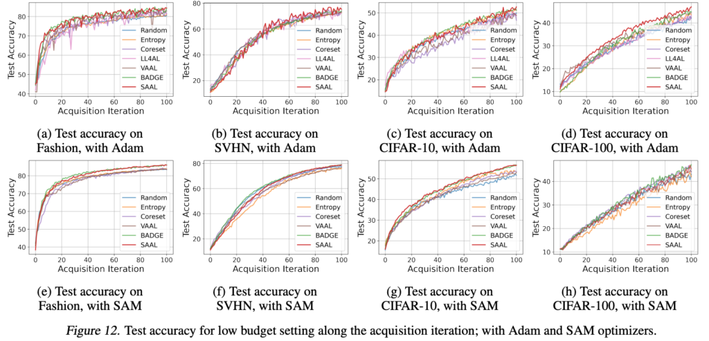 • 각 획득 단계 후 네트워크를 50epoch 학습, Adam 옵티마이저(lr=0.001)와 SAM 옵티마이저(lr=0.001 또는 0.1)를 사용