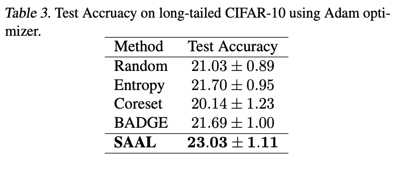 SAAL의 robustness를 추가로 평가하기 위해, long-tailed CIFAR-10 데이터셋을 만들어 low budget 설정에서 실험을 진행했습니다. Table 3에 따라, SAAL은 불균형한 상황에서도 다른 베이스라인보다 뛰어난 성능을 보였습니다.