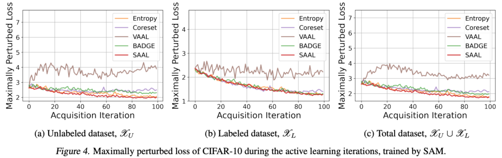• Figure 4c: 전체 데이터셋의 최대 perturb loss를 보여주며, 이는 식 (7)의 상한값에 해당합니다. SAAL은 가장 낮은 상한값을 달성하여, 궁극적으로 더 낮은 전체 loss를 달성할 가능성이 높습니다.