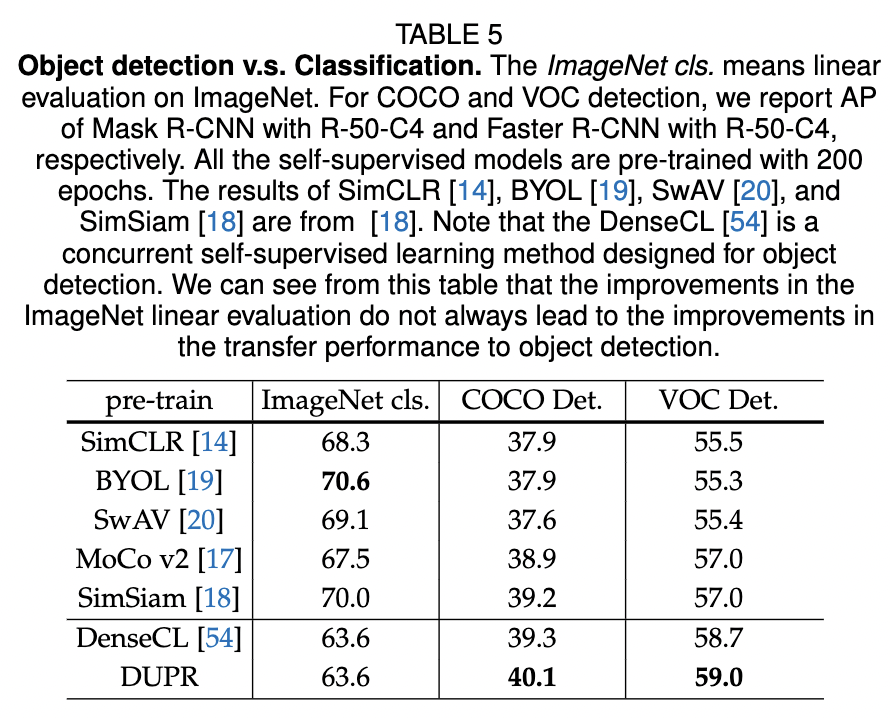 이러한 설정 하에서, 비교된 모델들과 함께 ImageNet 분류와 객체 탐지 성능 사이에 거의 상관관계가 없음을 알 수 있습니다. 예를 들어, MoCo v2는 ImageNet 정확도에서 BYOL보다 3.1점 낮지만 VOC AP에서 BYOL보다 1.7점 높습니다. DUPR과 DenseCL는 MoCo v2 베이스라인에 비해 ImageNet linear evaluation에서 3.7점 감소합니다. 이러한 감소는 패치 level 및 이미지 level 대조 손실의 공동 최적화가 더 어려워 이미지 level 대조 손실의 최적화에 영향을 미치기 때문일 수 있다고 말하고 있습니다. 분류를 위한 global representations과 위치 지정을 위한 local representation 사이의 더 나은 균형이 가능하지만, 이는 이 논문의 초점이 아니라고 합니다. 저자는 DUPR의 객체 탐지 향상이 더 나은 classification 능력에서 비롯된 것이 아니라 더 나은 localization 능력에서 비롯된 것임을 결론지을 수 있습니다.