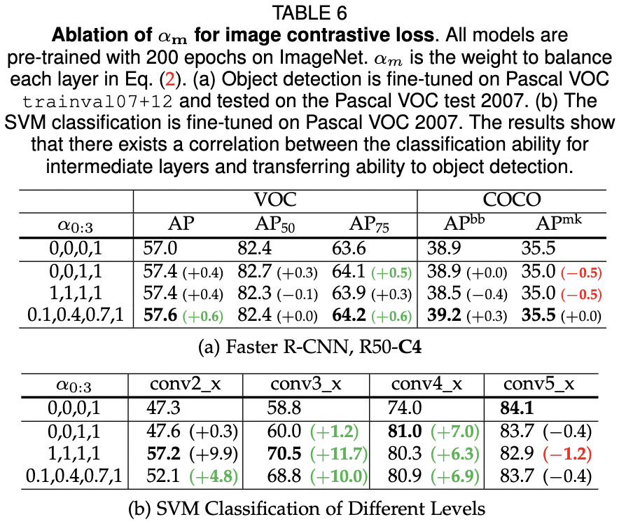 이 실험에서는 β(0:3)을 (0, 0, 0, 0)으로 설정합니다. 표 6 (a)의 결과를 통해 알 수 있는 점은 다음과 같습니다. (1) 모든 αm 구성은 VOC 탐지의 AP를 개선할 수 있으며, 특히 높은 IoU 메트릭 AP75에서 중간 level의 대조 손실이 위치 지정 능력을 개선할 수 있음을 시사합니다; (2) (0.1, 0.4, 0.7, 1.0)의 구성만이 VOC 및 COCO 탐지 모두에서 개선을 보여줍니다. shallow layers에 큰 가중치를 두는 구성(즉, (1, 1, 1, 1))이 COCO 탐지 성능을 저하시키는 이유는 두 가지 측면이 있습니다: (1) shallow layer에 큰 가중치를 두면 분류에 더 중요한 깊은 계층의 최적화에 영향을 미칩니다; (2) COCO는 VOC보다 더 많은 클래스를 포함하고 COCO의 성능은 분류 능력에 더 의존합니다. 표 6 (b)에서 알 수 있듯이, α0:3의 세 가지 구성 모두 shallow layer의 분류 성능을 크게 향상시킵니다.