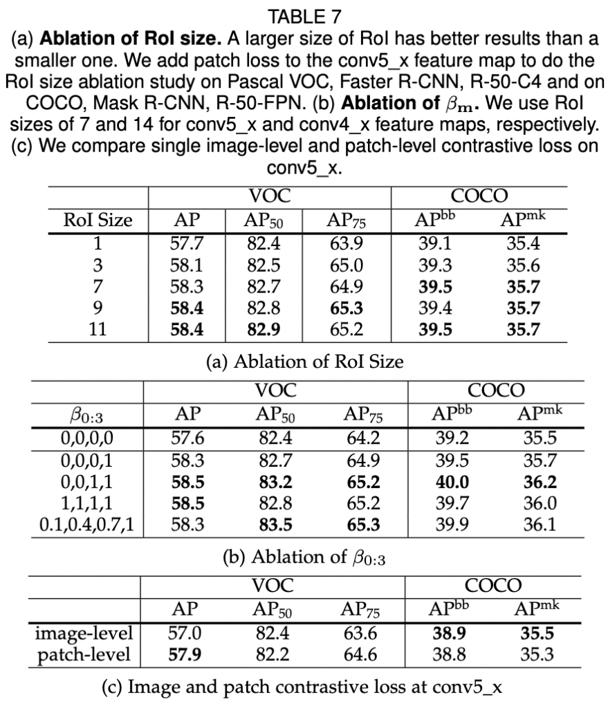 저자는 conv5 x에서 단일 이미지의 image-level 과 patch-level대조 손실을 비교합니다 (표 7 (c) 참조). patch-level 대조 손실은 classification 능력을 약간 감소시키지만 localization 능력을 향상시킵니다. 예를 들어, VOC 탐지에서 patch-level 대조 손실은 AP75를 1.0점 크게 향상시키지만 AP50을 0.2점 약간 감소시킵니다. 또한 COCO AP를 0.1점 약간 감소시키는데, 이는 COCO가 VOC보다 분류 능력에 더 중요하기 때문입니다 (COCO는 80개의 카테고리를 가지고 있는 반면 VOC는 20개의 카테고리를 가지고 있기에). 표 7 (b)의 하단 줄에서 보여주는 것처럼 image-level 과 patch-level 대조 손실을 결합하여 classification 과 localization 능력을 균형 있게 맞추었을 때 최고의 성능을 달성했습니다
