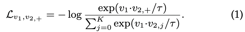 대조적 학습의 주요 아이디어는 positive views을 모으는 동시에 negative views을 밀어내는 것입니다. MoCo를 예로 들면, I가 원본 이미지이고, I1과 I2는 서로 다른 augmentation으로 동일한 이미지의 두 가지 view로 간주될 수 있습니다. v1과 v2,+를 I1과 I2의 정규화된 임베딩이라고 하면 대조적 학습의 목표는 positive 쌍(v1, v2,+)을 함께 모으는 동시에 negative 쌍(v1, v2,j)을 밀어내는 것입니다. 기본적인 learning objective는 InfoNCE Loss입니다: