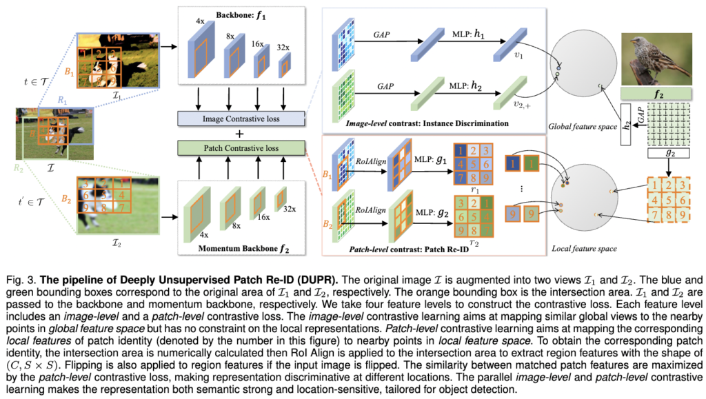 DUPR의 파이프라인은 Fig. 3에 나와 있으며, multi-feature levels에서 patch-level 및 image-level의 대조적 학습으로 구성됩니다. patch-level의 대조적 학습은 averaged pooling 전에 전체 피쳐 맵을 직접 최적화하고 일치하는 패치 간의 유사성을 극대화하여 위치 정보를 강화합니다. object detection는 localization과 분류의 결합이므로, 분류를 위해 의미 정보를 강화하기 위해 image-level의 대조적 학습을 포함합니다. 대조적 학습 프레임워크에 대해서는 MoCo v2를 baseline으로 선택합니다. 마지막으로, 대부분의 object detectors가 FPN 및 PANet과 같은 멀티-레벨 표현을 필요로 하기 때문에 패치 level 및 image-level의 대조적 손실을 멀티-피쳐 level에 추가합니다.