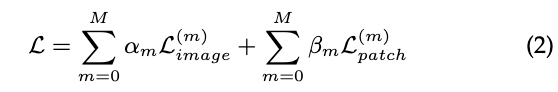 (2) 여기서 M은 피쳐 맵의 수입니다. L(m) image 및 L(m) patch는 m번째 레벨의 이미지 및 패치 대조 손실입니다. αm 및 βm은 다른 레벨의 중요도를 조절하는 가중치입니다.