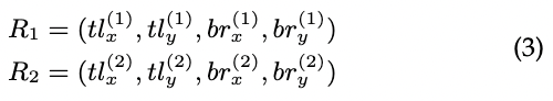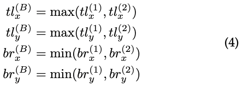 (3) 여기서 (tlx, tly )는 왼쪽 상단 꼭지점을 나타내고 (brx, bry )는 오른쪽 하단 꼭지점을 나타냅니다. 그런 다음 R1과 R2의 intersection(교차 영역) B = (tl(B)x , tl(B)y , br(B)x , br(B)y )를 다음과 같이 계산할 수 있습니다:
