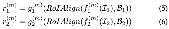 여기서 g(m) 1 및 g(m) 2는 MLP 레이어 및 모멘텀 MLP 레이어이며, r(m) 1 및 r(m) 2는 fregion features of a fixed shape(C, S × S)입니다. 그런 다음 r(m) 1,p 및 r(m) 2,p는 정규화된 피처 벡터의 positive 쌍이며, 여기서 p ∈ [0, S × S)는 교차 영역의 위치를 나타냅니다.