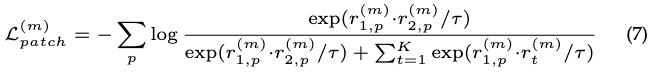 저자의 패치 Re-ID pretext task은 InfoNCE 손실와 MoCo v2를 사용합니다. 저자는 m번째 피쳐 맵에 대한 패치 level 대조 손실을 다음과 같이 구성합니다