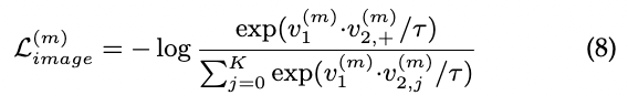 분류 능력을 향상시키기 위해 image-level의 대조 손실도 최적화합니다. 이때 v(m) 1 = h1(GAP (f (m) 1 (I1))) 및 v(m) 2,+ = h2(GAP (f (m) 2 (I2)))를 positive 쌍의 정규화된 이미지 특징으로 표시합니다. 간단함을 위해 정규화 표기를 무시합니다. 따라서 m번째 피쳐 맵의 image-level 대조 손실은 다음과 같이 작성될 수 있습니다