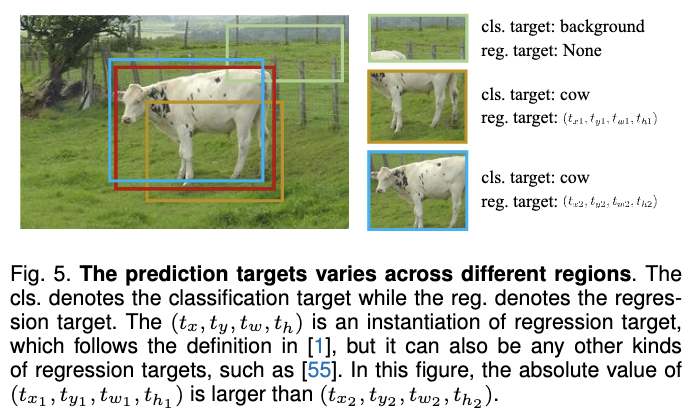 이전 방법들은 global representations을 최적화하고 구별력 있는 local representations을 학습하지 않습니다. 그러나 위치에 민감한 작업의 경우 피쳐 맵에 있는 다른 패치의 features은 달라야합니다. 예를 들어 아래의 Fig 5에 나와있듯이 다른 영역은 서로 다른 객체 범주나 배경을 나타낼 수 있습니다. 다른 영역의 regression targets도 다릅니다.