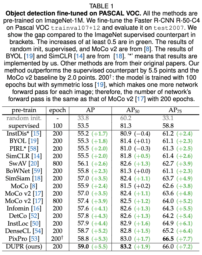 표 1의 결과는 DUPR이 다른 비지도 학습 방법과 지도 학습 방식들을 능가함을 보여줍니다. 대부분의 비지도 학습 방법은 AP75에서 지도 학습 방식을 능가하는데, 이는 지도 classification으로 학습된 표현이 분류와는 관련이 없지만 위치 지정에는 유용한 많은 정보를 잃을 수 있음을 나타냅니다. 그러나 이전의 비지도 사전 학습 방법은 여전히 분류를 위해 설계되었습니다.
