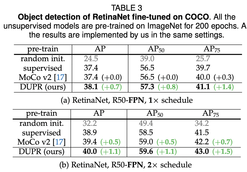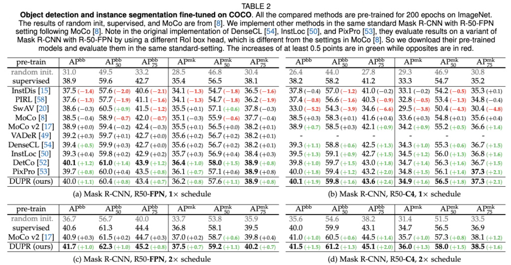 표 2 (b)에 나와 있듯이, 1× schedule에서는 DUPR이 다른 모든 비지도 학습 및 지도 학습 방식을 능가합니다. 2× 스케줄에서는 여전히 MoCo v2를 mAP에서 0.5점, ImageNet 지도 사전 학습을 mAP에서 1.5점 높은 모습을 보입니다.