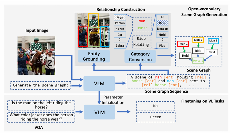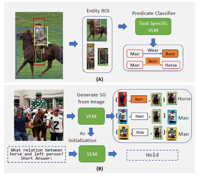 반대로 (B)의 경우는 저자가 제안하는 방식으로 VLM을 통해 Image에서 바로 SGG를 생성하는 모습을 보여줍니다.