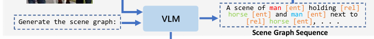 저자는 SGG 문제를 sequence generation 문제로 정의합니다. 정확히는 Image로 부터 caption을 생성하는 Vision Language Model (VLM)을 활용합니다. 정확히는 저자가 정의하는 Scene Graph Prompt를 활용하여 이미지 내에서 존재하는 relation들을 설명하는 Scene Graph Caption을 생성합니다.