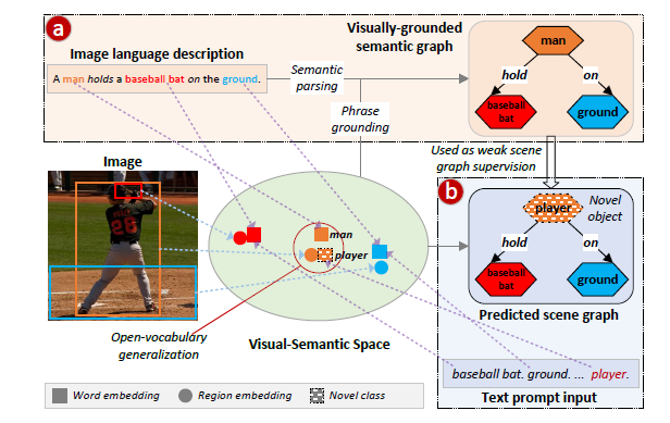 다음으로 [CVPR 2023] Learning to Generate Language-supervised and Open-vocabulary Scene Graph using Pre-trained Visual-Semantic Space 의 경우는 Ov-SGG와 Weakly Supervision 문제를 동시에 해결할 수 있는 방법을 제안하였습니다. 전적으로 GLIP이라는 object-level Vision-Language Pretraining 모델의 사전 학습 공간을 활용하여 이를 Ov-SGG + Weak Supervision에 맞춰 최적화 시켰다고 볼 수 있습니다.