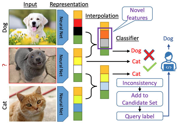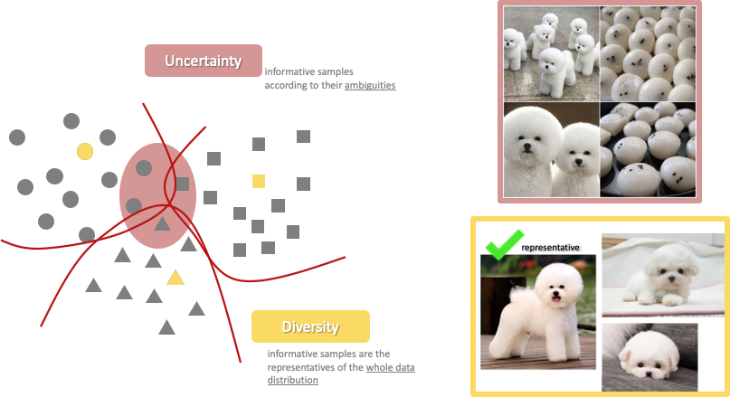 일부 Uncertainty 샘플링은 위의 이미지처럼 “비숑인지 술떡인지 헷갈리는 불확실한 샘플”을 찾기 위해 모델의 출력을 사용합니다. 그러나 저자는 단순히 모델의 출력만을 사용하여 불확실한 샘플을 찾을 경우, 고차원 데이터로부터 모델의 현재 상태를 완전히 전달하기 어렵다고 생각하였습니다. 따라서 저자는 Feature를 함께 사용하는 방식을 제안하였습니다.