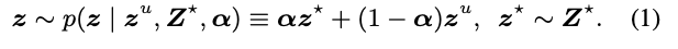 먼저, Labeled feature와 Unlabeled Feature를 각각 z^*, z_u 로 표기하겠습니다. 이 두 Feature를 선형 결합하여 다음과 같은 새로운 Feature \tilde{z_?}=??^∗+(1−?)z_u를 만듭니다. 여기서 interpolation 계수를 의미하는 α는 0과 1 사이의 값입니다. 이렇게 아주 간단하게 새로운 Feature \tilde{z_?}를 생성하였습니다.