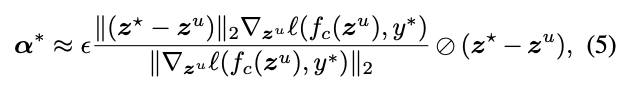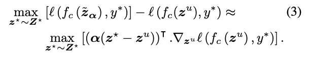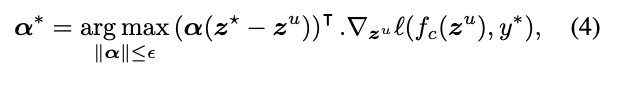 본 논문에서는 적절한 α 값을 수동으로 선택하는 것이 어렵기 때문에, Unlabeled 데이터에 대해 적합한 ? 값을 선택하기 위한 최적화 접근 방식을 제안하였습니다: 바로 loss 함수의 변화를 최대화하는 α 값을 찾는 것입니다. 즉, 수식 (3)을 이용하여 ? 값을 최적화하는 수식은 다음과 같습니다: