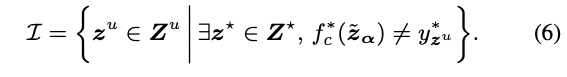 이제 데이터를 선택하는 단계까지 왔습니다. 위에서 feature를 선형결합하는 방식에 대해 설명드렸는데, 이 때 알파 값은 매우 작아야 잘 동작한다고 합니다. 그렇다는 것은 Unlabeled feature에 Labeled Feature를 아주 조금 섞는 것이고, 이를 노이즈가 추가되는 것이라고도 해석할 수 있죠. 결국 저자는 feature에 노이즈를 추가했을 때 예측값이 변화하는 그런 불확실한 샘플을 선택하는 것을 목표로 하였습니다. 위에서 설명한 방식으로 선택된 후보 집합은 아래와 같이 정의됩니다.