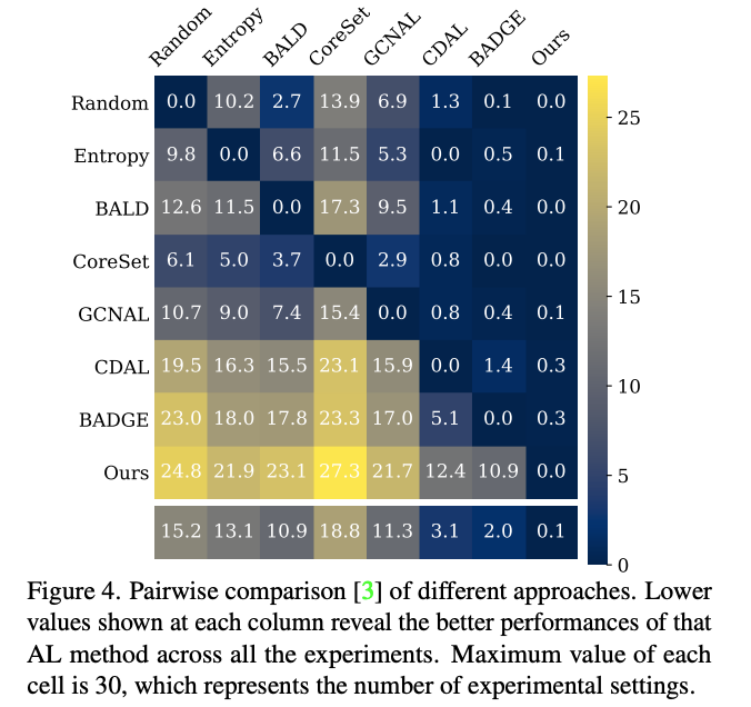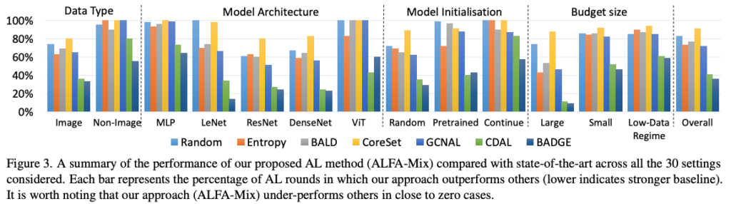 저자가 제안하는 ALFA-Mix는 다양한 데이터셋, Budget 크기, 네트워크 아키텍처(총 30가지 설정)에서 다른 방법들과 비교 실험을 수행하였습니다. 상단 그림 4와 같이, 각 설정에서 ALFA-Mix는 대부분의 경우 다른 방법들보다 우수한 성능을 보였습니다. 예를 들어, CDAL 및 BADGE과 비교할 때, ALFA-Mix는 30개의 실험 중 각각 12.3 및 10.6개의 실험에서 더 나은 성능을 보인반면, ALFA-Mix가 성능이 떨어진 경우는 거의 없었습니다. 전체적으로 ALFA-Mix는 거의 모든 실험에서 다른 방법들과 비교하여 뛰어난 성능을 보였습니다.