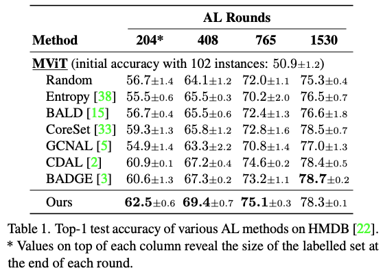 ALFA-Mix는 비디오 분류 작업 성능도 비교하였는데, HMDB 데이터셋을 사용했을 때, 처음 두 번 라운드에서 랜덤 샘플링보다 5% 이상, 마지막 라운드에서는 3% 이상의 정확도 향상을 보였습니다. 또한 처음 세 번의 라운드에서 다른 방법론들에 비해 2% 이상의 성능 향상을 보였습니다.