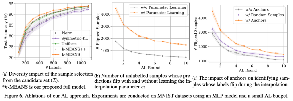 그림 6(b)에서 볼 수 있든, interpolation parameter α에 대한 학습 과정을 생략하면, 후보 집합에서 선택되는 샘플 수가 크게 줄어듭니다. 이는 클러스터링 중에 선택되는 샘플의 다양성에 부정적인 결과를 가져올 수 있따고 합니다.