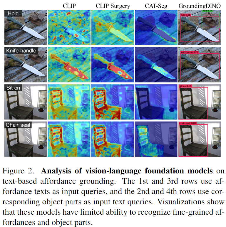 이를 위해 이미지-텍스트 데이터로 학습된 VLM을 활용하여 학습하지 못한 객체와 장면, 개념에 대한 추론을 수행하고자 하였습니다. 그러나 VLM모델은 affordance나 객체의 일부분에 대한 차이를 이해하지 못하는 경우가 많았으며, 저자들은 이에 대해 학습 과정에 affordance와 객체의 특정 부분에 대한 정보를 학습하지 못한 것으로 가설을 세우고, foundation 모델이 affordance와 같이 사물의 미묘하고 세부적인 정보를 학습할 수 있도록 연구를 수행하였습니다.