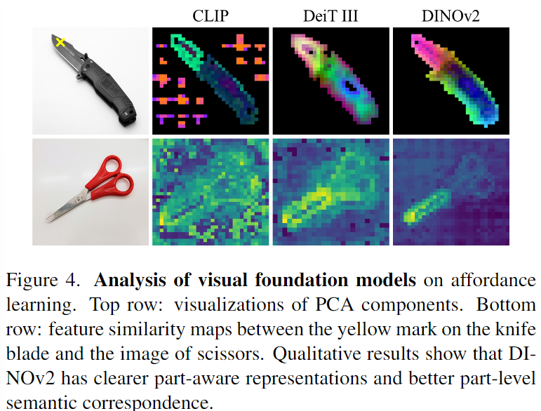 - 의미론적 관계에 대한 평가를 위해 칼과 동일한 affordance로 이루어진 가위를 이용하여 분석을 수행합니다. Figure 4의 2행은 칼날에 해당하는 패치(칼 이미지에서 노란색 x표시 된 부분의 feature)와의 cosine 유사도를 나타낸 것으로, DINOv2에서 칼날에 대응되는 영역을 잘 인식할 수 있음을 확인할 수 있습니다. 반면 CLIP은 전경과 배경에서 불분명한 대응이 이뤄짐을 확인할 수 있으며, DeiT Ⅲ는 객체에 대해서는 인식이 가능하지만, 그 안에서 객체의 칼날과 손잡이에 대한 구분이 어려운 것을 확인하실 수 있습니다.