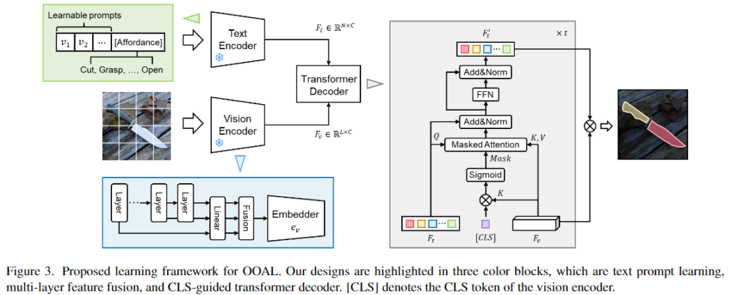 - 기존 foundation 모델에 대한 분석을 통해 OOAL에 대한 가능성을 확인한 후, VLM 모델을 이용하여 학습 구조를 설계하고 visual feature와 affordance에 대한 text label 사이의 정합을 개선하기 위한 네트워크 설계