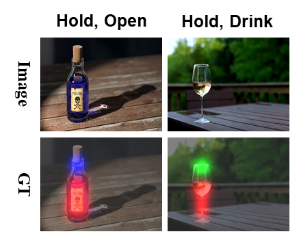- 23,716 이미지로 구성되며 인간과 사물의 상호작용 이미지에서 affordance를 학습하고, 객체 중심적 이미지에서 affordance localization을 수행하는 것을 목표로 함.