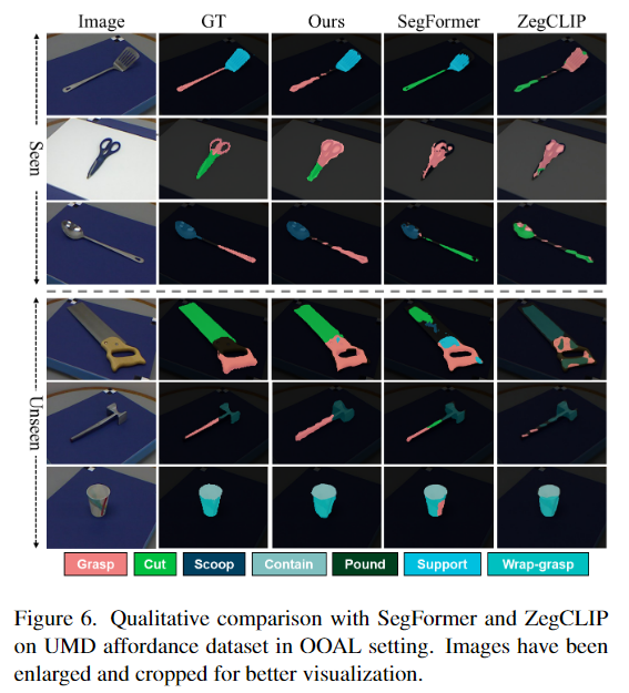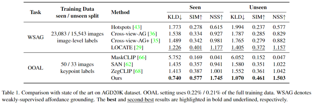 AGD20K 데이터는 이미지 수준의 weakly-supervised affordance 방식(WSAG)과 비교를 수행합니다. WSAG는 이미지 수준의 라벨을 활용하지만, 저자들이 사용한 방법론과 비교했을 때 460배가 넘는 학습 데이터를 사용합니다. 위의 Table 1은 WSAG 방법론과 비교했을 때도 가장 좋은 성능을 보이는 것을 확인하였으며, OOAL 세팅에서 평가를 위해 open vocabulary segmentation 방식인 MaskCLIP, SAN, ZegCLIP와도 비교를 하였으며, 큰 성능 개선이 이루어짐을 확인하였다고 합니다. 정성적 결과는 위의 Figure 5에서 확인하실 수 있습니다.