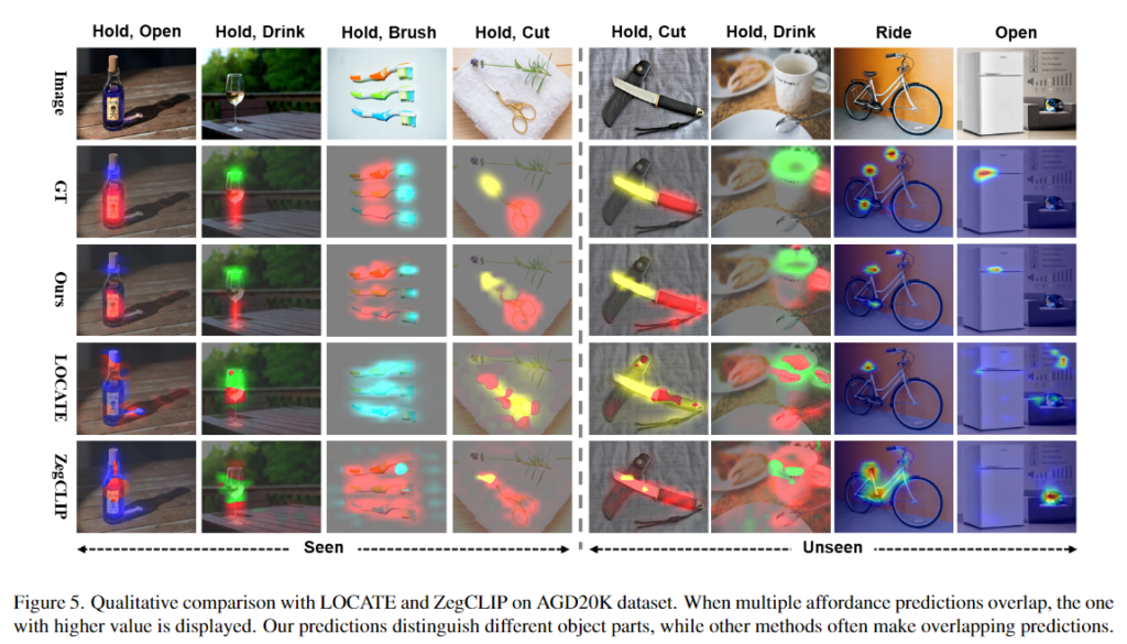 이 질문을 기반으로 4가지 대표 모델로 vanilla CLIP[3], CLIP기반의 설명가능한 모델인 CLIP Surgery[4], open vocabulary segmentation에서 SOTA 방법론인 CAT-Seg[5], open vocabulary detection 방법론인 GroundingDINO[6]를 선정하였다고 합니다. “somewhere to [affordance]”라는 형식으로 text prompt를 주어 visual feature에서 해당하는 영역을 찾았으며 이에 대한 시각화 결과는 Figure 2에서 확인하실 수 있습니다.